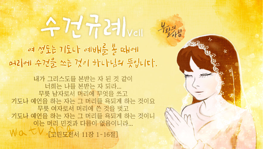 "세상의 빛과 소금이 되라"는 말씀대로 시온 식구들의 선한 행실을 보고 가족이나 친지, 이웃분들에 이르기까지 많은 분들이 하나님의 교회를 방문하고 있습니다. 그분들이 함께 예배를 드리면서 하는 질문 중의 하나가 하나님의 교회에서는 예배 때에 왜 여성도들이 머리에 수건을 쓰는가 하는 내용입니다.