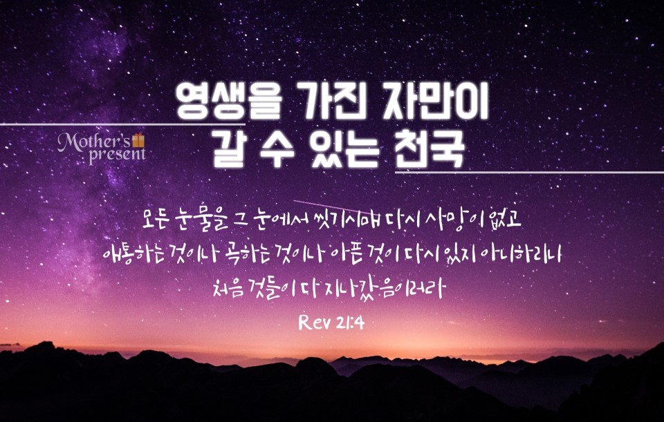 천국은 다시는 사망이 없는 곳입니다. 이 말씀은 언젠가는 죽을 존재들은 절대로 천국에 들어갈 수 없다는 뜻입니다. 예수님께서 우리에게 영생 주시기를 그토록 원하신 이유가 여기에 있습니다. 예수님께서 죽을 수밖에 없는 우리를 영생체로 만들어 천국에 데려가시고자 유월절을 지키리고 명하신 것입니다.