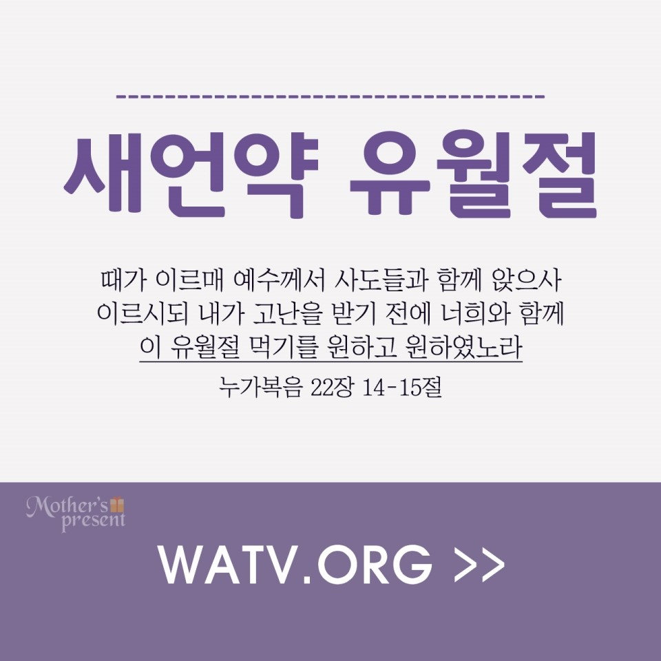 예수님께서는 새 언약 유월절을 세우시며 생명과 인 당신의 살과 피를 먹을 수 있는 방법을 알려주시면서 "내가 고난 받기 전에 유월절 먹기를 원하고 원하였노라" 고 말씀하셨습니다. 예수님께서 왜 유월절 지키기를 그토록 원하고 원하셨을까? 하늘에서 범죄 한 죄로 말미암아 죽게 된 인류 인생들에게 영원한 생명을 주시는 것이 하나님의 간절하신 바람이기 때문입니다. 다시 말해 인류가 죽음에 고통에서 벗어나 영생을 얻는 방법이 바로 유월절인 것입니다.