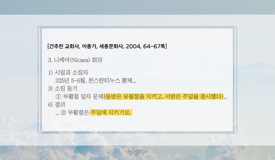 그러나 이 생명과의 진리를 싫어하는 사단은 사람들의 마음을 충동해서 주후 155년, 197년 또 325년 세 차례의 논쟁과 종교 회의를 거쳐 교묘하게 유월절을 없애버렸습니다. 동방교회에서 중시했던 유월절을 없애고 서방교회를 중심으로 유월절 다음에 오는 첫 번째 일요일(부활절)을 기념하게 함으로써 날짜를 변경해 유월절을 지킬 수 없도록 한 것입니다.