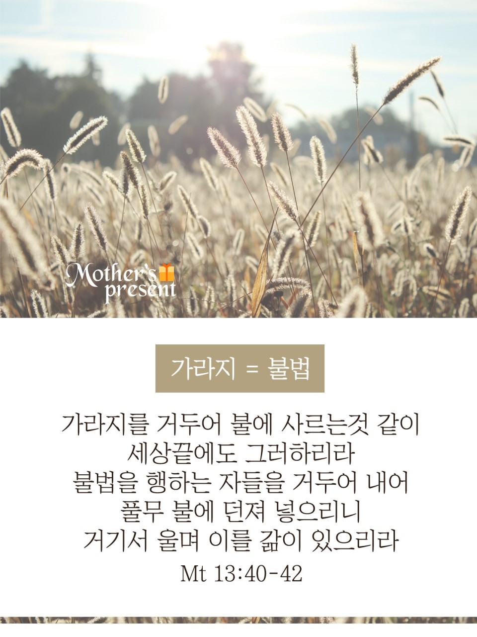 가라지를 불사르게 내어준다고 하신 것을 해석에서는 불법자를 풀무불에 던져 넣는다고 하셨습니다.